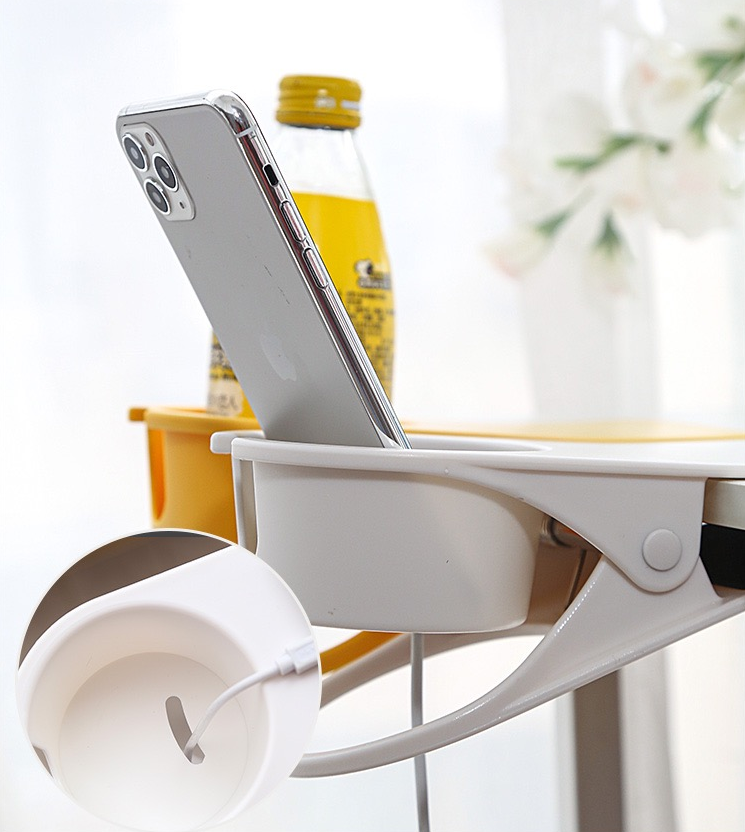 Introducing our multi-functional Table Side Cup Holder. Its unique bottom opening design allows for easy charging of your phone while taking up minimal space on your table. Its sturdy metal clamp and anti-slip sponge padding securely hold cups with handles on desks from 2CM up to 4.5CM thick table. Enjoy its practicality and elegance in any space.