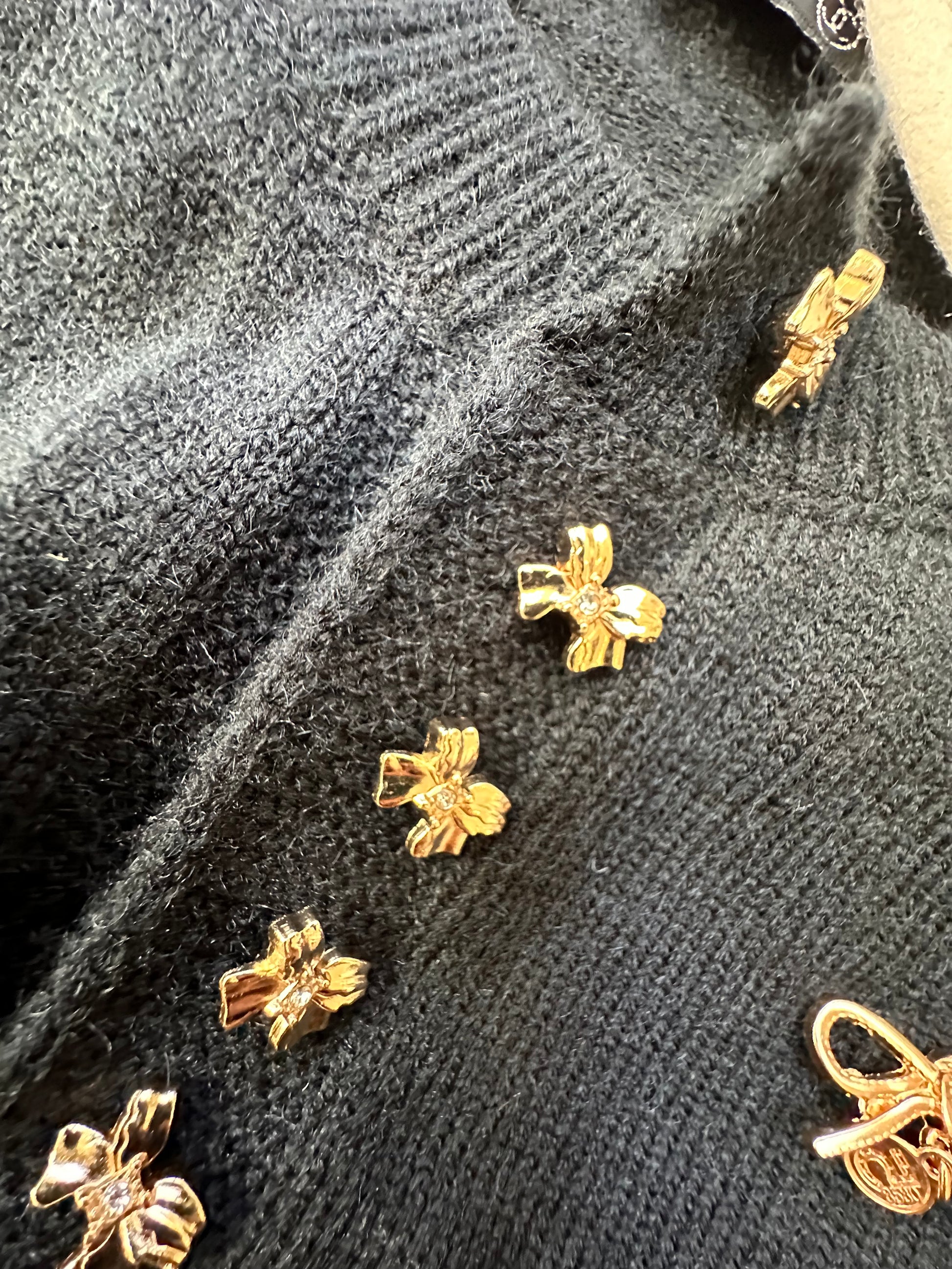 Indulge in luxury with our Wool Cardigan. Made from the finest wool, this cardigan features golden metallic flower-shaped buttons for a touch of sophistication. Elevate any outfit with this elegant piece and stay cozy in style.